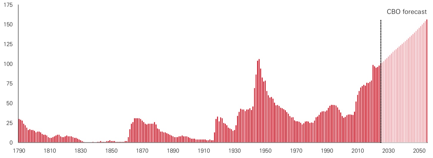 - The US federal debt is approaching levels last seen during World War II, driven primarily by structural fiscal challenges, including entitlement spending and rising net interest payments