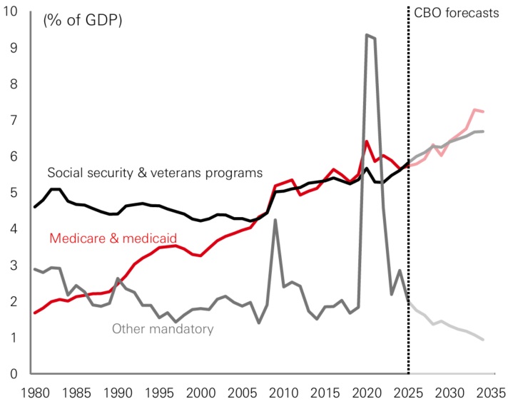 The US federal deficit is driven by rising mandatory spending and net interest payments, alongside low tax rates. Demographic shifts, such as an increasing old-age dependency ratio, exacerbate fiscal challenges.