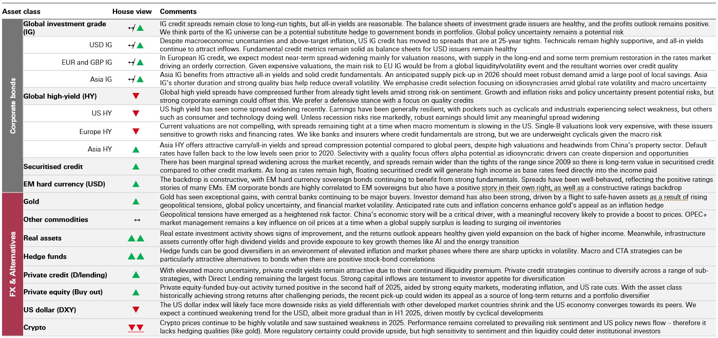 - Views are based on regional HSBC Asset Management Asset Allocation meetings held throughout January 2026, HSBC Asset Management’s long-term expected return forecasts which were generated as at 31 December 2025, our portfolio optimisation process and actual portfolio positions