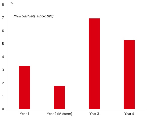 Historically, the second year of a US presidential term tends to be a tricky one for markets. It’s often the weakest for real stock returns in the S&P 500, thanks to the uncertainty that midterm elections bring. Investors don’t like surprises; unexpected policy shifts and questions about the economic outlook often weigh on risk appetite during this time.