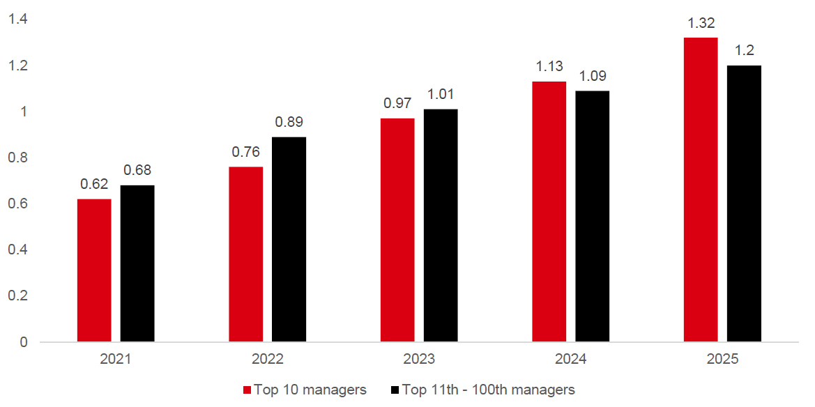 Allocations to top 10 managers vs the rest (EUR trillion)