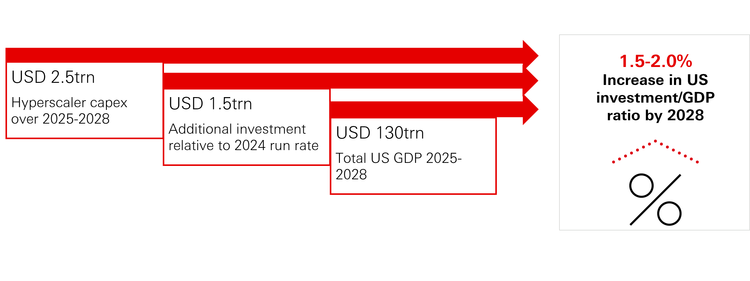 The AI investment boom has become a key pillar of US growth. Hyperscalers have repeatedly revised capital-expenditure plans higher, with cumulative data-centre and AI-related capex for 2025-2028 now estimated at around USD 2.5 trillion. Adjusting for the already elevated 2024 run-rate brings the incremental figure closer to USD 1.5 trillion. Set against an estimated USD 130 trillion in cumulative US GDP over the same period, this implies an increase in the investment-to-GDP ratio of roughly 1.5-2 percentage points by 2028.