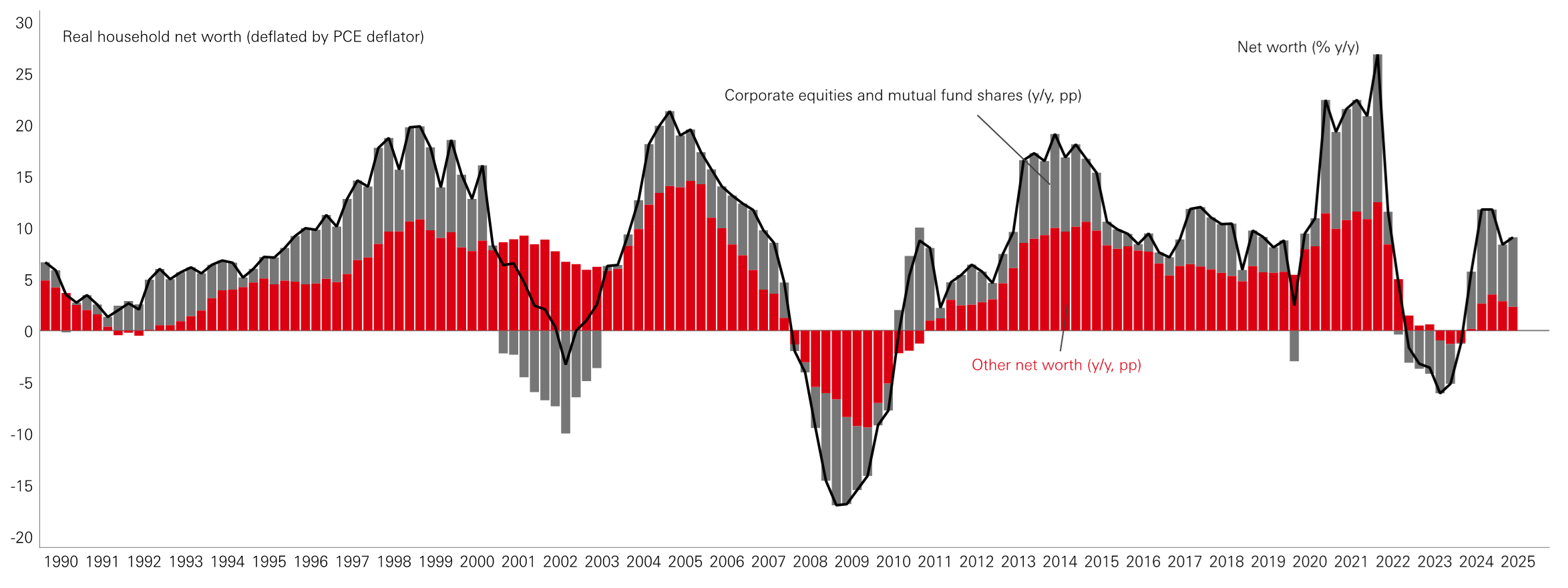 For many households, the benefits of the AI boom are muted. Strong gains in equities and mutual funds have supported net worth for wealthier households, who hold most financial assets. But real household net worth, adjusted for inflation, is not unusually elevated. Housing wealth is much more important for lower- and middle-income households, and the stagnant housing market has limited the gains for this asset in recent years.