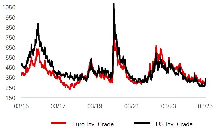 - Overall, spread valuations in European credit markets remain tight, calling for cautious positioning amid macroeconomic uncertainty. However, elevated yields and sector diversification, particularly in hybrid securities and sustainable bonds, offer opportunities for investors seeking higher returns without sacrificing credit quality