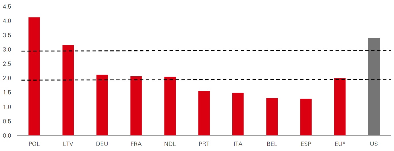 However, Europe’s domestic policy environment is shifting and becoming more growth supportive. Increased defence spending has become a top priority given the US has signalled a reduction in military support with its commitment to NATO now a source of debate. European leaders are reassessing their defence capabilities, with the Trump administration calling for European nations to increase their contribution. Heightened security concerns from the Russia-Ukraine conflict have already led to increased spending across the continent. Since 2022, many NATO member states have met the alliance's 2 per cent GDP spending target, while countries like Portugal, Italy and Spain plan to reach it by 2028/29. However, there has been some discussion within NATO about raising the target to 3 per cent, which would require an additional EUR 180bn of funding for the eurozone NATO members. Moreover, the US has even suggested increasing the target to 5 per cent.