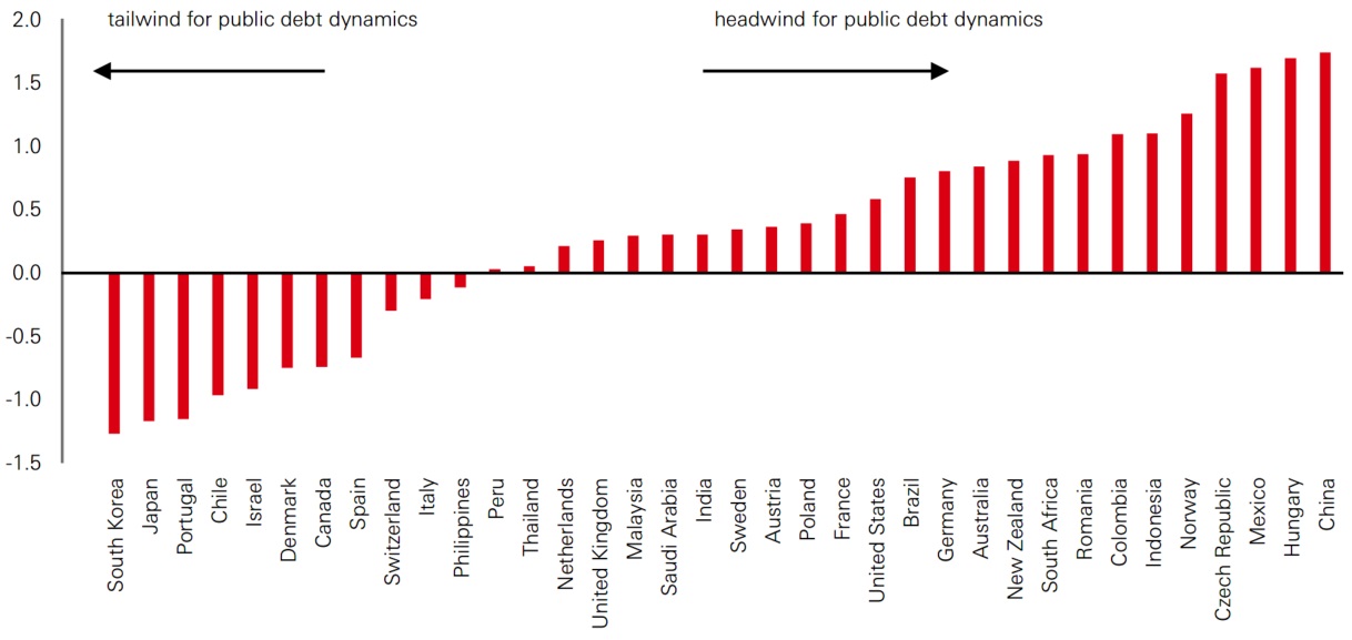 A useful measure of public debt sustainability is the relationship between the interest rate paid on debt (R) and nominal GDP growth (G). This metric determines whether a government can stabilize or reduce its debt-to-GDP ratio without running a fiscal surplus. A positive R-G score (where R exceeds G) creates a headwind for fiscal sustainability, while a negative R-G (where G exceeds R) provides a tailwind.