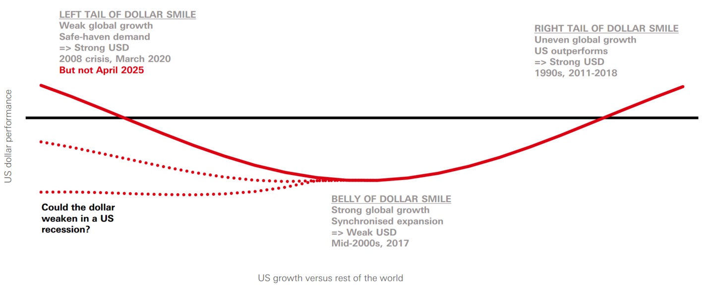 The "dollar smile" framework, which suggests that the dollar performs well during periods of US economic outperformance or global risk aversion, may become less reliable. There may be a spread of outcomes along the left tail of the smile – i.e. the safe-haven role of the dollar may not be guaranteed, and the greenback could decline during future risk-off episodes too.